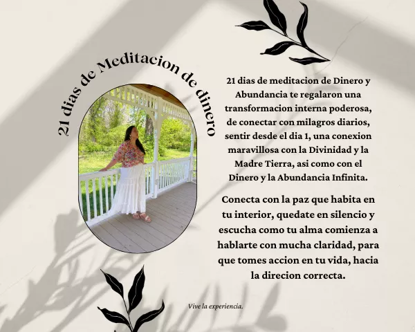 Descubre el poder transformador de la meditación en nuestro Reto de 21 días de Meditación para el Dinero, la Abundancia y la Espiritualidad. Durante estas tres semanas, te guiaré para que desarrolles el hábito diario de meditar, conectando con tu ser más profundo y con energías de alta vibración. Este programa está diseñado para reprogramar tus creencias limitantes sobre el dinero y la abundancia, permitiéndote abrirte a nuevas posibilidades financieras y espirituales.